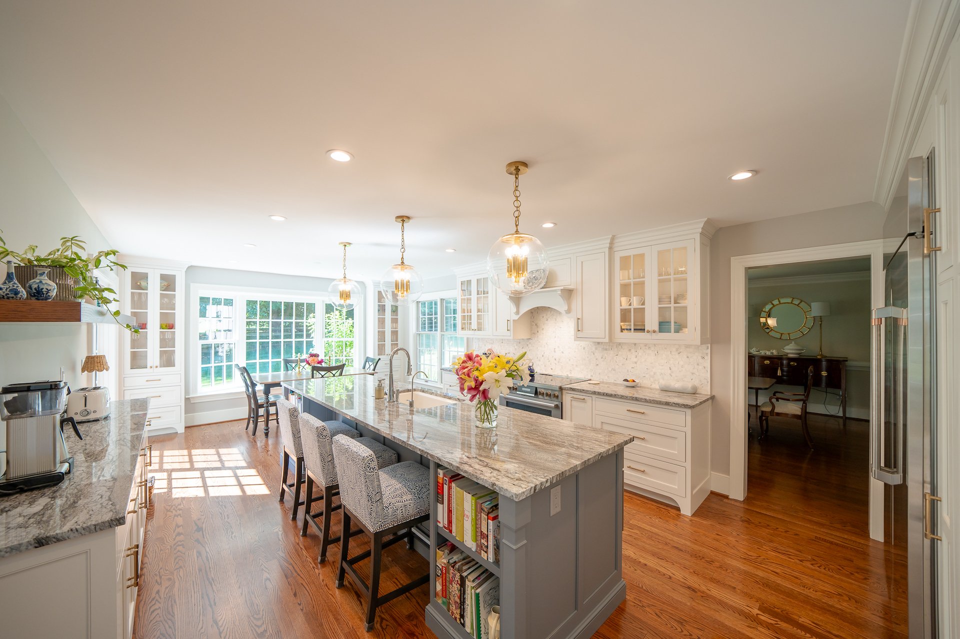 To enhance the classic design, Hazley Builders extended custom cabinetry to the ceiling, accentuating the white, painted cabinets with elegant glass-paneled doors. Collaborating closely with our clients, we designed a decorative hood to serve as the room’s main focal point. The overall cabinet design also incorporated additional pantry space for increased storage. Soft, neutral gray tones were integrated into the color palette through granite countertops, a tile backsplash, and an accented island.